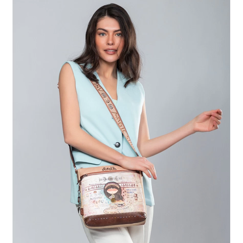 тази чанта за рамо е среден размер и има предни и задни джобове. лицевата щампа на колекцията Anekke Menire е пълна със символика и препратки към културата на жените от Амазонка. Anekke е изобразена с бродирани детайли върху косата и дрехите си.